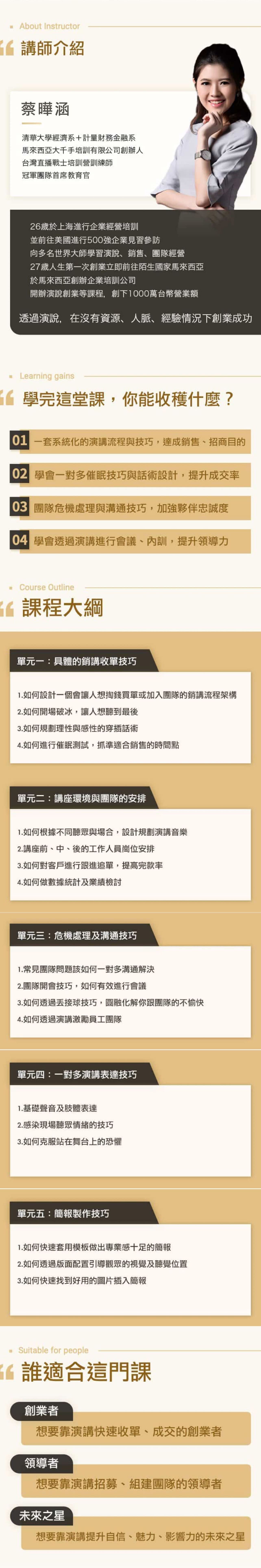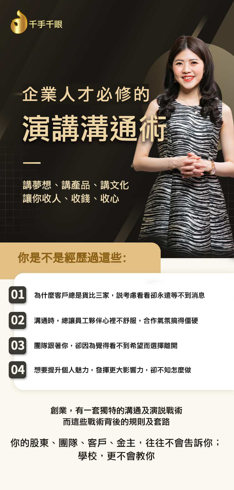 在這門課程裡,我將會整理我這幾年所有關於透過演講創業成功的秘訣,用有系統性的方式,教會給你,包含如何透過演講招募團隊、危機處理、團隊訓練、銷售產品或服務,細到連現場的音樂安排、燈光冷氣、演講時的催眠測試、演講活動的工作人員崗位規劃、處理團隊問題的話術、面對團隊危機時該講什麼故事,涵蓋創業者必須會的演講、溝通等技巧,都會在這門課程跟你分享!